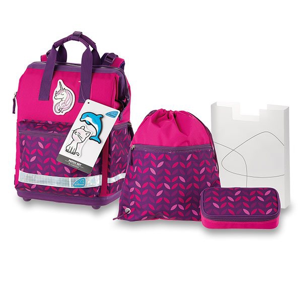 * voděodolný zip u hlavní přihrádky, * pohodlné rukojeti na nošení aktovky, * dělicí přepážka, rámeček pro rozvrh hodin, * přední kapsa na svačinový box s termoizolací, * boční kapsa s držákem na lahev, * anatomicky tvarovaná záda s odvětráváním 3D AirMesh, * výškově nastavitelný nosný systém, * polstrované, anatomicky tvarované ramenní popruhy 3D AirMesh s reflexními prvky, * výškově nastavitelný ramenní a hrudní popruh, * odnímatelný bederní pás pro optimální rozložení váhy, * reflexní prvky ORAFOL®, * poutko pro zavěšení aktovky, * stabilní, zpevněné, voděodolnéa snadno omyvatelné dno, , SÁČEK NA CVIČKY s přední kapsou na zip, uzavírání na šňůrku. Šňůrka je provléknuta i spodními rohy sáčku, takže při stažení horní části mohou šňůrky na bocích sloužit, jako popruhy a sáček je možné nosit jako batůžek. Rozměr 31 x 37 cm., , PENÁL na psací potřeby s uzavíráním na zip. Na horní klopě kapsa s uzavíráním na zip a dalšími dvěma kapsičkami. Rozložitelná prostřední klopa s 20 poutky, uzavírání na suchý, zip. Rozměr 21 × 10 × 6 cm. Penál je dodáván prázdný., , TIP: Set můžete doplnit také kvalitním kufříkem [https://activacek.cz/produkt/detsky-kufrik-schneiders-princess-9730/?initiator=search&product=13284&anchor=0141%2F4937354] na výtvarnou, výchovu.