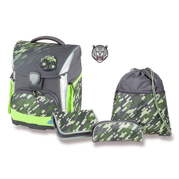 4kusový set obsahuje školní aktovku, penál, pouzdro na psací potřeby a sáček na cvičky., , AKTOVKA - ROZMĚR: 31 X 40 X 23 CM, HMOTNOST: 1300 G, OBJEM: 22 L, , * anatomicky tvarovaná záda s odvětráváním, * polstrované držadlo, * polstrované, výškově nastavitelné popruhy s reflexními prvky, * výškově nastavitelný hrudní popruh, * hlavní komora s flexibilní dělící přepážkou, 2 menší kapsičkami, háčkem pro přípnutí klíčů a rámečkem pro rozvrh hodin, * vyměnitelný obrázek na suchý zip - 2 kusy, * kvalitní uzavírání na zámek - nové patentované magnetické zapínání TipLock, * přední a dvě postranní kapsy s uzavíráním na zip, * boční kapsy dostatečně velké pro uložení láhve s pitím, * stabilní, zpevněné, voděodolné a snadno omyvatelné dno, * odvodňovací ventil, * LED světelné pruhy po stranách aktovky pro zvýšení bezpečnosti, * reflexní prvky, * 3D aplikace, * voděodolný materiál, , SÁČEK NA CVIČKY s přední kapsou na zip, uzavírání na šňůrku. Šňůrka je provléknuta i spodními rohy sáčku, takže při stažení horní části mohou šňůrky na bocích sloužit, jako popruhy a sáček je možné nosit jako batůžek. Rozměr 32 x 38 cm., , PENÁL s uzavíráním na zip, jednopatrový s 2 chlopněmi, na 30 tužek, 2 plastové přihrádky na rozvrh hodin. Rozměry 20 x 13,5 x 4 cm. Penál je dodáván prázdný. Vybavit ho můžete, psacími psacími potřebami nebo pastelkami a fixami., , POUZDRO na psací potřeby uzavírání na zip, rozměry 21 x 7 x 8 cm.
