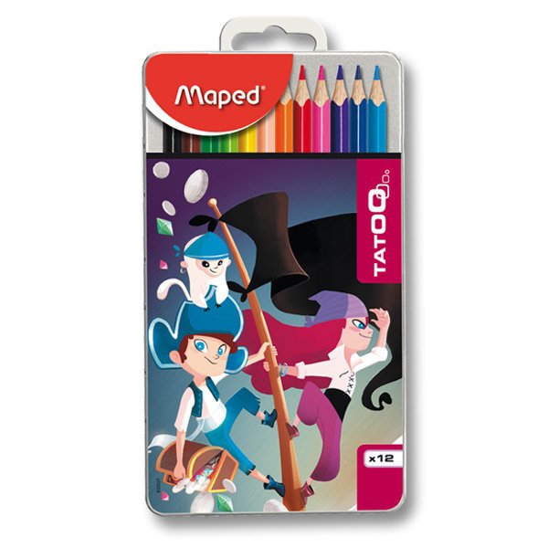 * pouzdro odolné proti nárazům, chrání pastelky proti poškození, * trojhranné tělo, * měkká odolná tuha, * jasné barvy, * délka pastelky cca 17 cm, * tloušťka tuhy je 2,9 mm, * motiv pouzdra: Princezna nebo Piráti, , [pastelka 2,9 mm] [ergonomic 03] [odolné vůči nárazům] [pouzdro], , Pastelky jsou součástí kolekce Maped Tatoo Child. Ve stejném designu si můžete pořídit i ořezávátko, kuličkovou tužku, nůžky nebo penál Princess., , [otestováno]PODÍVEJTE SE NA NÁŠ BLOG ŠKOLNÍ SVĚT, JAK TYTO PASTELKY DOPADLY V NAŠEM TESTU PASTELEK.