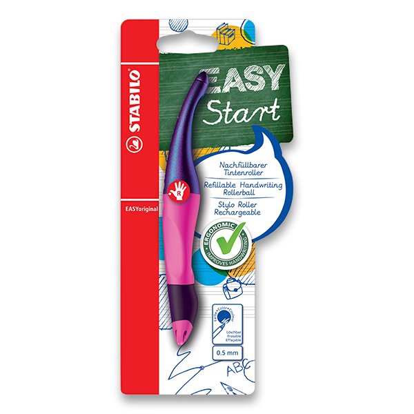 [pro praváky], * první roller v ergonomickém tvaru, ve variantě zvlášť pro leváky a praváky, * moderní alternativa plnícího pera, * tvarovaný úchop z neklouzavého materiálu, * jedinečný design, * nový hrot s každou novou náplní, velmi jednoduchá výměna, * ZMIZÍKOVATELNÝ MODRÝ INKOUST, * balení obsahuje 1 náplň a štítek na jméno, * šíře stopy 0,5 mm, Uvolněné držení napomáhá proti předčasné únavě svalstva ruky a bolestem ruky při psaní (případné bolesti zad a hlavy). Díky kuličce v náplni lehce klouže po papíře, lehká a, komfortní manipulace., [0,5 mm], Náhradní náplň Stabilo EASYoriginal. K vymazání inkoustové stopy doporučujeme zmizík Stabilo ColorKilla., Technologie rolleru umožňuje školákům psaní bez škrábání na papíře. Nedělá kaňky, při psaní lehce klouže a i výměna náplně je zcela jednoduchá a bez špinavých rukou. , STABILO EASYoriginal intuitivním způsobem NAPOMÁHÁ SPRÁVNÉMU DRŽENÍ, je proto VHODNÝ JAK PRO ZAČÍNAJÍCÍ DĚTI, TAK I PRO STARŠÍ ŠKOLÁKY. Jeho úchopová zóna je vytvarovaná, zvlášť PRO PRAVÁKY a PRO LEVÁKY. , Školákům, kteří se psaním začínají a potřebuji širší stopu, je určena náplň s šíří stopy Medium (0,5 mm). Pokud by stopa byla tenká, začali by na psací potřebu tlačit, a tím, se zbytečně stresovali. Dokoupit je možné i náplň s užší šířkou stopy Fine (0,3 mm), která je doporučována starším školákům zhruba od 3. třídy.